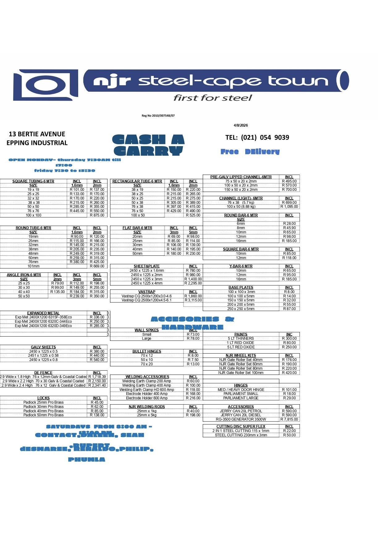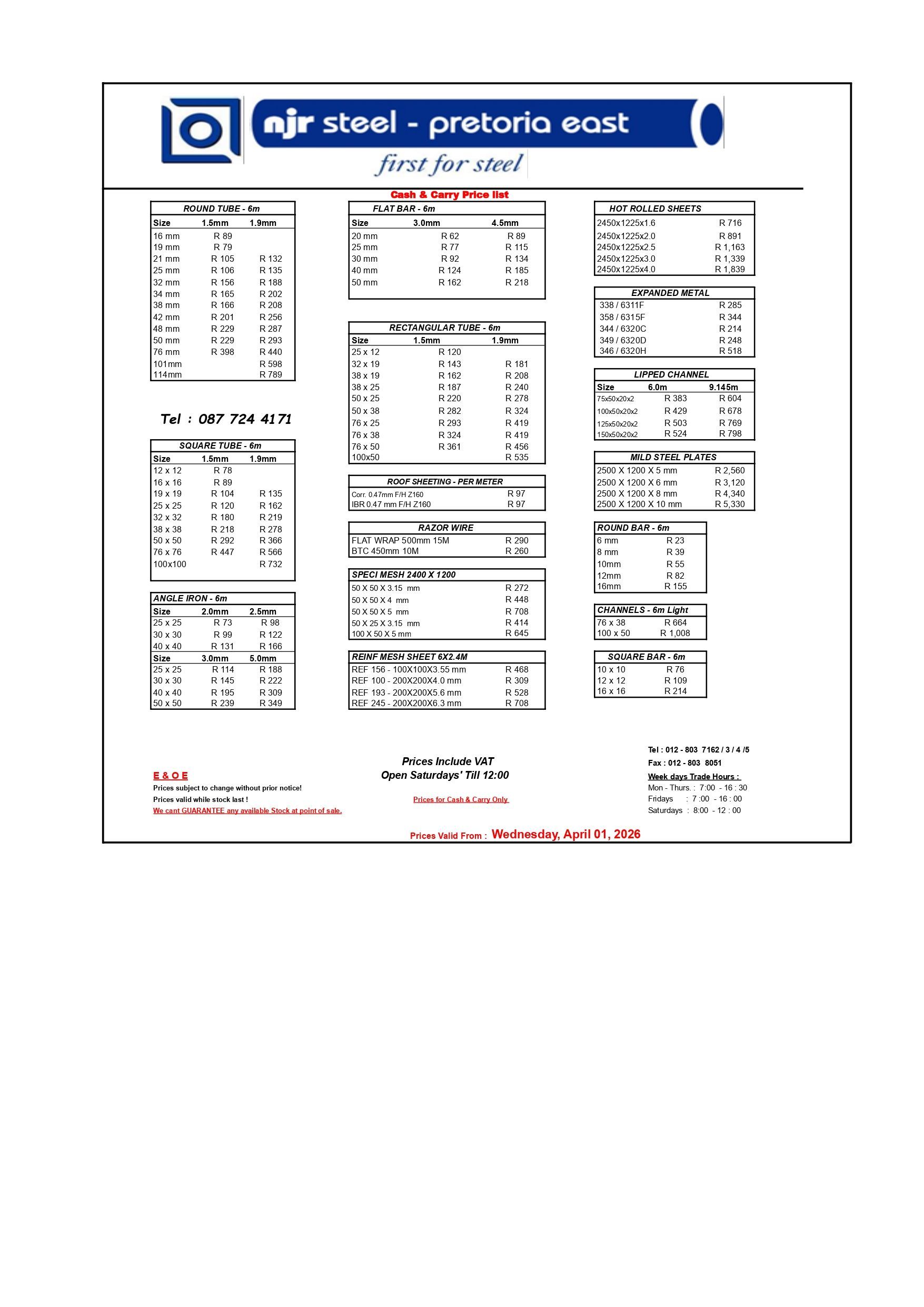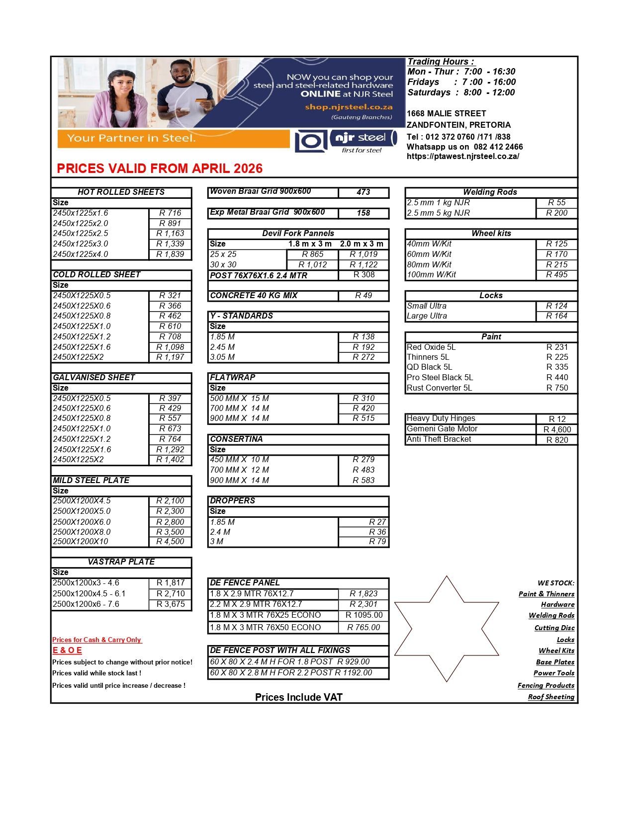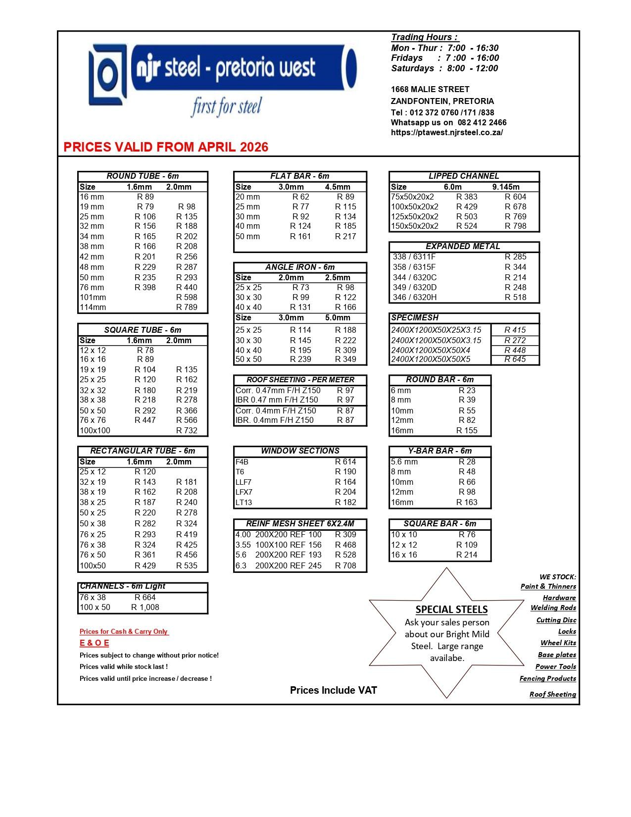 You can find our NJR Steel Pretoria East, NJR Steel Pretoria West, & NJR Steel Cape Town Cash & Carry Price Lists below for a guideline of our Cash & Carry prices.