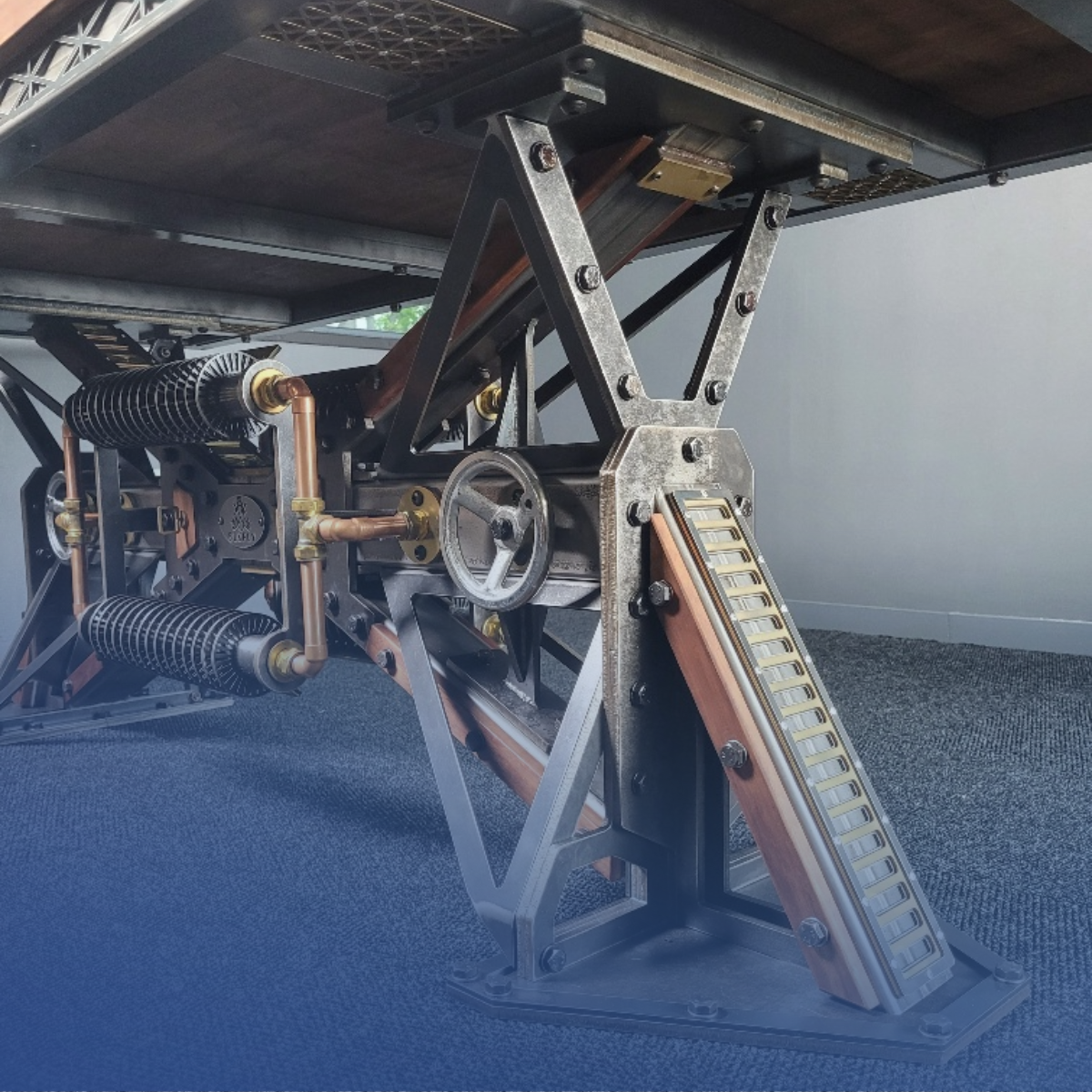 The theme is steampunk industrial, and the original desk was designed based on the UK flag. We had to make it "Suid-Afrikaans," so copper tubing and industrial bolts were used and TIG-welded. The welding seams are all hidden on the desk itself, but for some parts, the welding had to be visible. Button-head bolts and rivets tie all the elements together.